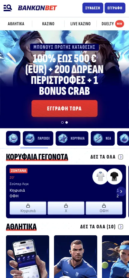 Όταν παίζετε από κινητό, δεν πρέπει να νιώθετε ότι χρησιμοποιείτε μια “lite” έκδοση. Στην πλατφόρμα μας, το Bankonbet Casino παιχνίδι από κινητό σας δίνει τις ίδιες κατηγορίες παιχνιδιών με το desktop, όπως φρουτάκια, επιτραπέζια παιχνίδια, live casino, τζακπότ, αθλητικό στοίχημα και εικονικά αθλήματα. Για παίκτες που αναζητούν καζίνο Bankonbet Ελλάδα, υποστηρίζουμε πληρωμές σε EUR και ένα λόμπι παιχνιδιών σχεδιασμένο να φορτώνει καθαρά σε σύγχρονους browsers κινητών.